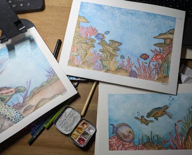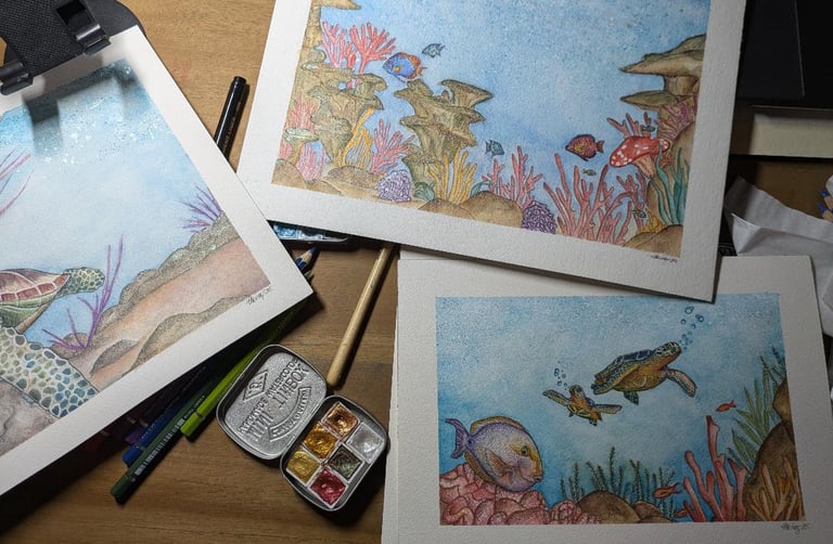 Créer un univers poétique à l'aquarelle avec des couleurs douces et apaisantes, ainsi que des personnages attachants. Découvrir l'univers marin autour des récifs coraliens Australiens, et sensibiliser autour de cet écosystème.