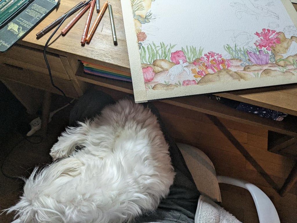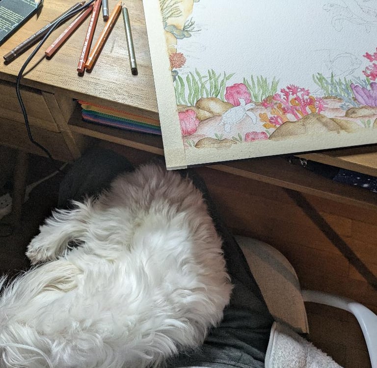 Un bureau en bois massif, des étagères décorées de bocaux remplis de pinceaux, des crayons de couleur et petites boites d'aquarelles scintillantes, et un fidèle compagnon, mon petit bichon maltais, qui n'est jamais loin de moi lorsque je peints!
