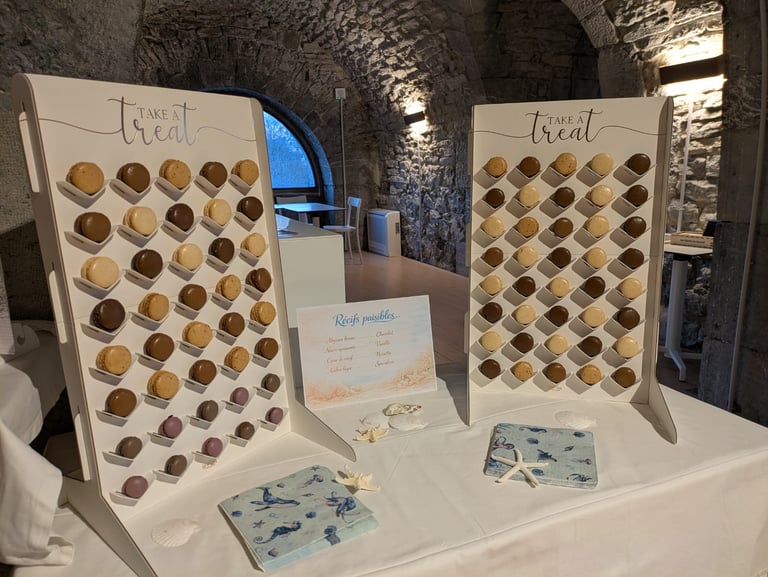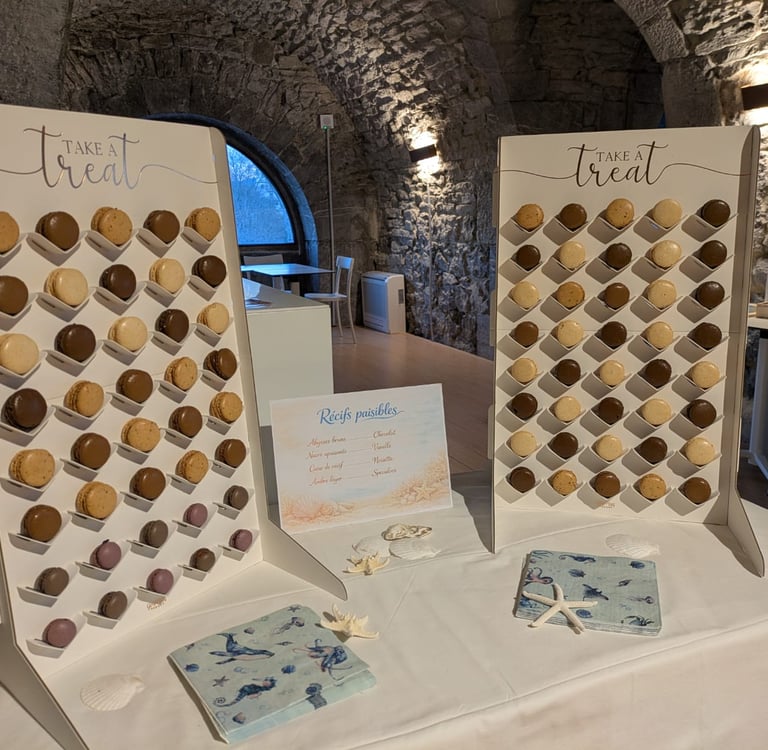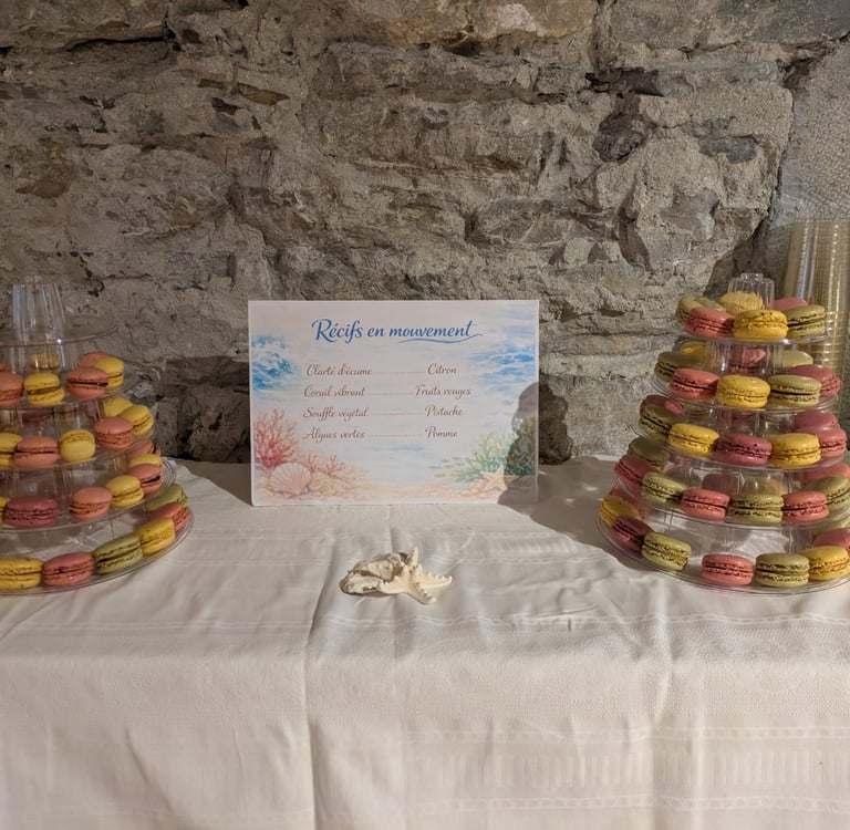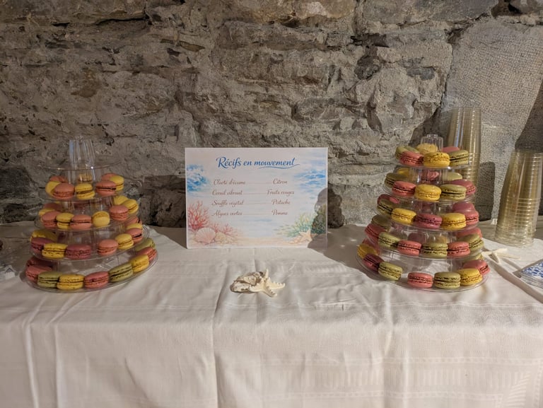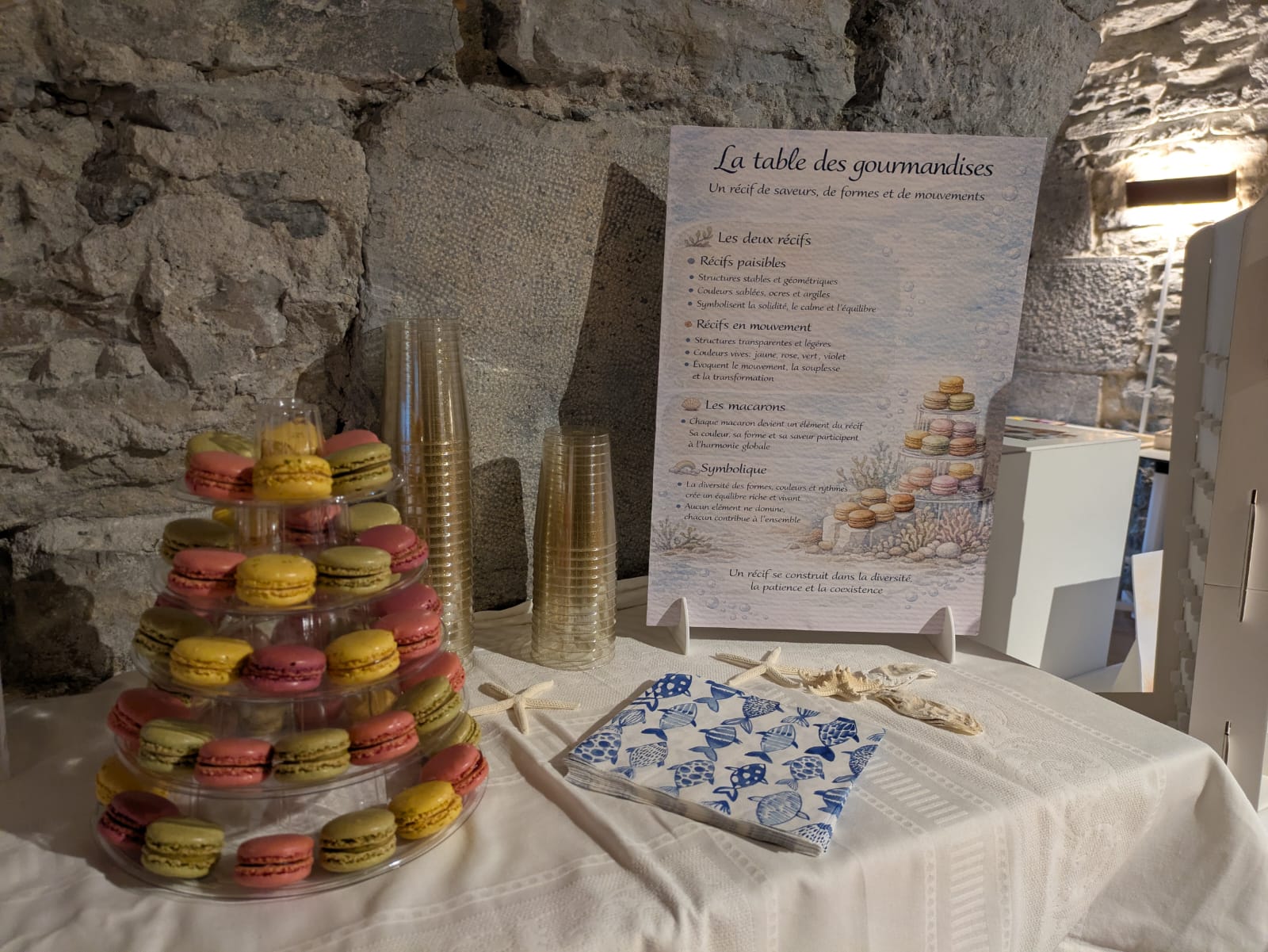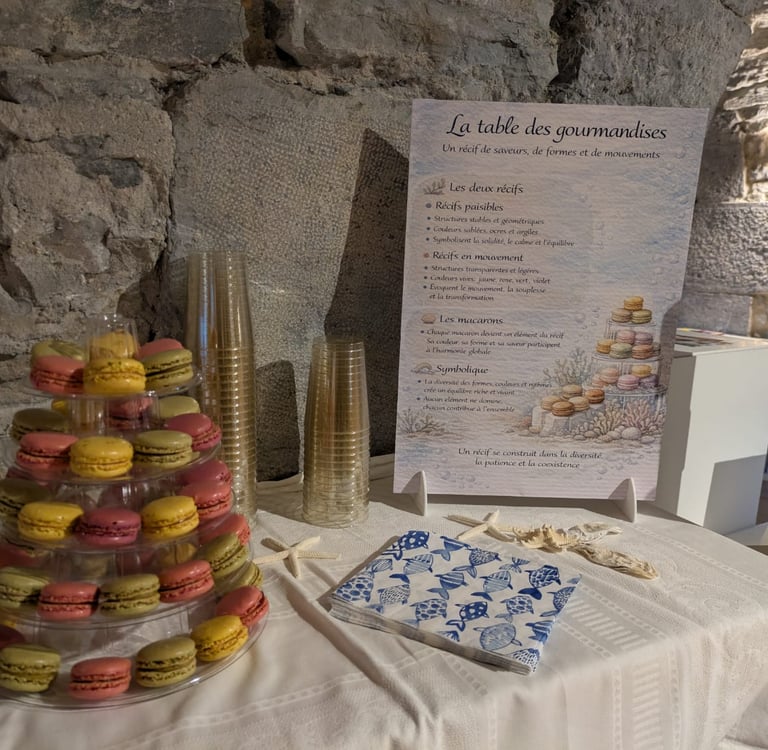 La table des gourmandises : tout comme les récifs coralliens de la Grande Barrière de corail, la table des gourmandises a été installée pour imiter d'un côté les récifs dits "paisibles" avec des macarons aux teintes chocolat, sable et beige, et de l'autre, les récifs dits "en mouvement" avec des teintes plus colorées comme le vert, le jaune et le rose. La diversité des formes, couleurs et textures créent un équilibre riche, varié et vivant. Aucun élément ne domine, chacun contribue à l'ensemble. Les structures paisibles symbolisent la roche et les coraux durs. Les structures dits "en mouvement" évoquent les algues et les anémones qui se balancent avec les courants d'eau...