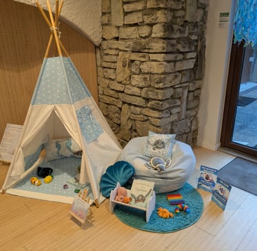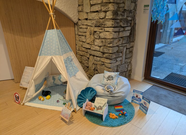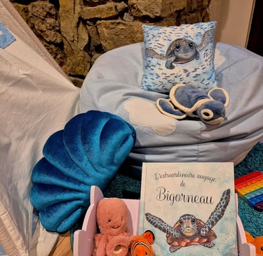 Le coin neuro amical : un coin à reproduire à l'école comme à la maison. Lieu d'apaisement pour tout enfant ayant besoin de régulation émotionnelle ou sensorielle. A disposition : jouets sensoriels, casque anti-bruit, livres illustrés, coussins, pouf, tapis coloré, peluches douces sur la thématique de la mer, tipi qui peut se refermer pour un moment de détente cocooning, musique...