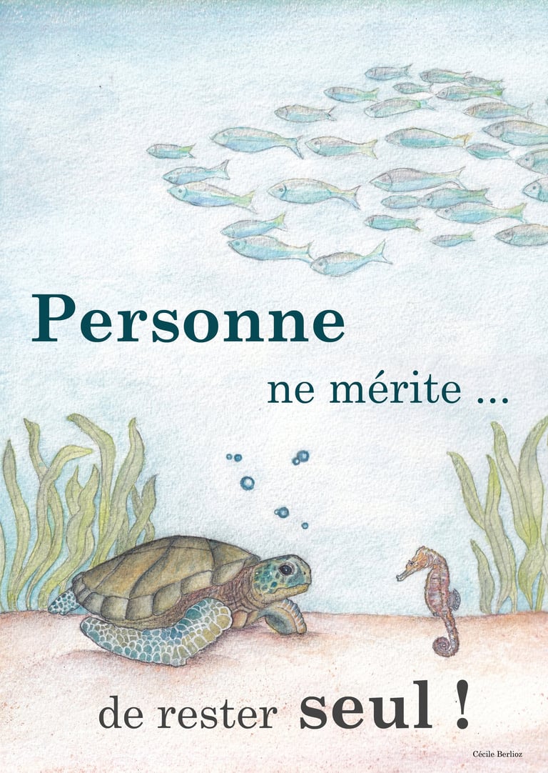 Cette affiche est réalisée à l'aquarelle dans des teintes apaisantes et plutôt fraîches, et porte le slogan "Personne ne mérite de rester seul".